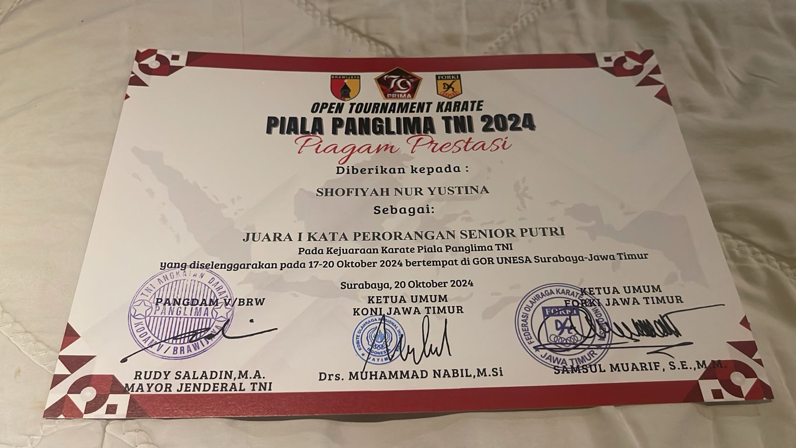 JUARA 1 SHOFIYAH NUR YUSTINA KEJUARAAN KARATE PUTRI