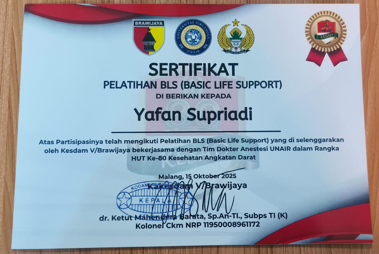 ATAS PARTISIPASI YAFAN SUPRIADI DALAM MENGIKUTI PELATIHAN BLS YANG DISELENGGARAKAN OLEH KESDAM V/BRW DENGAN TIM DOKTER ANASTESI UNAIR DALAM RANGKA HUT-80 KESAD